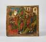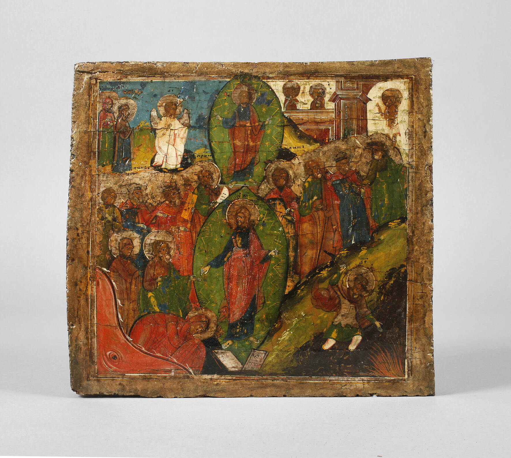 Russland, 18. Jh., kirchenslawisch bezeichnet, Tempera auf Laubholzplatte, partielle Goldstaffage, Darstellung der Auferstehung und Höllenfahrt Christi sowie der Befreiung der Urväter aus dem Hades, vermutlich ursprünglich das zentrale Mittelfeld einer großformatigen Festtagsikone, partiell retuschiert, etwas rest.bed., Maße 28 x 27 cm.