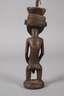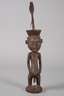 Kongo, 1. Hälfte 20. Jh., Holz geschnitzt, dunkel gefasst, stehende männliche Figur, der Kopf bekrönt von schmiedeeisernem Schmuckelement, Altersspuren, H 34 cm.