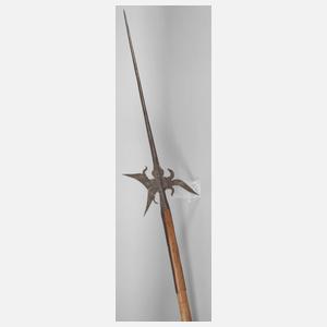 wohl Historismus, Vierkantspitze, zweiteilige gebogene Schneide des Blatts, langer Schnabelhaken, ohne Schmiedemarke, Schaft alt ergänzt, L Blatt ca. 75 cm, L ges. ca. 245 cm.