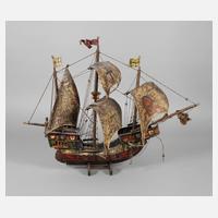 Mitte 20. Jh., bez. Santa Maria, Holz geschnitzt, farbig gefasst, textile Takelage, Segel aus bemaltem Leder, miniaturhafter Nachbau einer Hansekogge, Altersspuren, nicht ganz komplett, L 75 cm.