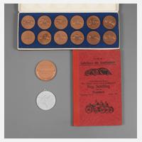 12 Medaillen des Allgemeinen Deutschen Motorsport Verbandes, Avers mit Oldtimern, im Etui, kupferfarben, D ca. 35 mm; Medaille Kreiswehrspartakiade 1980, D ca. 46 mm; Medaille für verdienstvolle Mitarbeiter im VEB Automobilwerk Eisenach; dazu Lehrbuch für Kraftfahrer von August Schilling, 104 Seiten.