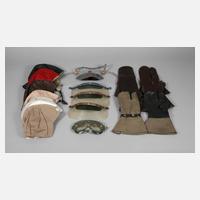 1930–50er Jahre, bestehend aus vier Schutzschilden für Motorradhelm, einer Motorradbrille, neun Stoffhauben, drei Lederhauben und drei Paar Handschuhe mit Stulpen, teilweise guter bis unbenutzter Zustand.