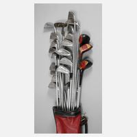 20. Jh., alle gemarkt, u.a. Walker Hagen, Lynx, Jack Nicklaus McGregor, insgesamt 20 Eisen, in Ledertragetasche, unterschiedliche Maße und Erhaltungen, H max. 110 cm.