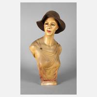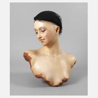 1920er Jahre, ungemarkt, Masse farbig gefasst, Bruststück einer jungen Frau mit eingesetzten Glasaugen und Wimpern aus Echthaar, vermutlich für ein Hutgeschäft, auf flachen Marmorsockel montiert, oberflächliche Altersspuren, sonst gute Erhaltung, H ca. 72 cm.