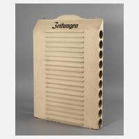 1930er Jahre, aus einem Café, Korpus aus weiß lackiertem Schichtholz, auf der Front bezeichnet, seitlich offene Röhren zum Einschieben der Zeitungen, Wandhalterung, Alters- und Gebrauchsspuren, Maße 78 x 60 x 7 cm.