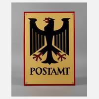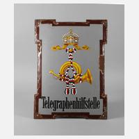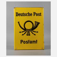 um 1900, ungemarkt, hochrechteckiges gebauchtes Schild, mit ausgestellten Eckzwickeln, mehrfarbig emailliert, zentrales Motiv eines bekrönten Posthorns, vier originale Bohrungen, Emailleverluste im Randbereich, kleiner Kratzer, sonst gute Erhaltung Z 2, Maße ca. 66 x 48 cm.