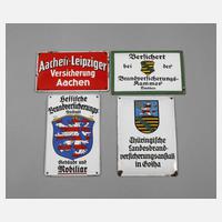 Anfang 20. Jh., unterschiedliche Druckvermerke, u.a. C. Rob. Dold, Boos & Hahn sowie Unionwerke Radebeul, gebauchte, mehrfarbig emaillierte Türschilder verschiedener Versicherungsanstalten, alle mit originalen Bohrungen, Z 1–2, L max. 22 cm.