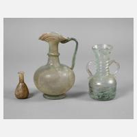 vorderer Orient, wohl 1.–3. Jahrhundert nach Christi, unautorisiert geprüft, aus grünstichigem Glas, unregelmäßig geformt, mit changierendem Lüster, zwei Henkelvasen mit spiralförmigen Zierauflagen, Bodenfund, H max. 17 cm.