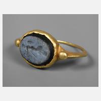1.–3. Jh. n. Chr., blaue Glaspasten-Nicolo-Gemme, darauf eine schwebende Victoria, Gold, teilweise hohl gearbeitet, G ca. 4,35 g, D Gemme ca. 12 x 9 mm, D Ring ca. 24 mm.