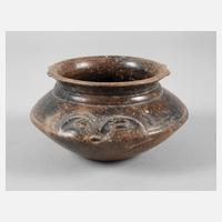 wohl Maya-Kultur, leichter Scherben dunkel gefasst, flacher Korpus mit zarter Profilierung, ausgestellte Mündung mit zwei angedeuteten Handhaben, die Wandung verziert von stilisierten Gesichtszügen, stärkere Altersspuren, D ca. 17 cm.
