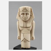 um 1920, Elfenbein beschnitzt, vollplastisch in Form eines stilisierten Sarkophags gearbeitet, auf späteren Holzsockel montiert, Altersspuren, trocknungsrissig, H 9,5 cm.