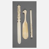 Ende 19. Jh., ungemarkt, Elfenbein aufwendig beschnitzt, bestehend aus kleinem Schuhlöffel, Papiermesser mit blütenverziertem Griff und Zigarettenspitze, leichte Altersspuren, L max. 23 cm.