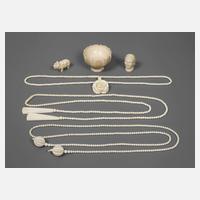 um 1920, sechs Teile, dabei drei Ketten, eine mit Anhänger in Form einer Rosenblüte, dazu Miniaturschälchen, Mädchenbüste und kleines beschnitztes Rhinozeros, unterschiedliche Maße und Erhaltungen, L max. 88 cm.
