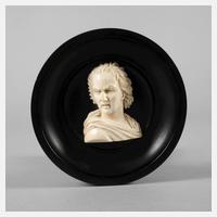 19. Jh., ungemarkt, Elfenbein qualitätvoll beschnitzt, Bruststück eines wütenden Mannes, auf späterer geschwärzter Holzapplik montiert, Altersspuren, D 15 cm.