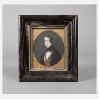 um 1930, unsigniert, Gouache auf Karton, Halbfigurenbildnis eines jungen Mannes in der Mode des Biedermeier, vor dunklem Grund, hinter Glas in profilierter geschwärzter Leiste gefasst, Altersspuren, IM 10 x 8,5 cm.