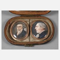 um 1830, unsigniert, Gouache auf Elfenbein, in feiner Lupenmalerei ausgeführte Herrenportraits, hinter Glas in schmaler Rotgoldleiste gefasst, im flachem Lederetui, dieses verschlissen, H je ca. 3,7 cm. BITTE BEACHTEN: VERSAND ERFOLGT NUR INNERHALB DER EU - SHIPPING TO THE EU MEMBER COUNTRIES ONLY!