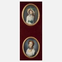 1. Hälfte 20. Jh., undeutlich signiert, Gouache auf Elfenbein mit partieller Weißhöhung, Halbfigurenbildnisse zweier junger Schönheiten in historisierender Manier, im Medaillon hinter Glas gefasst, auf samtbezogener Applik montiert, diese verziert von Quaste und Messingornament, H je 40 cm.