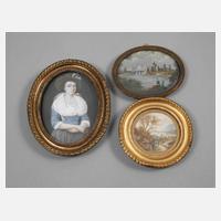 19. Jh., unsigniert, Gouache auf Karton, zwei Landschaftsdarstellungen mit Figurenstaffage, dazu Halbfigurenbildnis einer jungen Frau im blauen Kleid, alle hinter Glas in goldbronzierter Leiste gefasst, unterschiedliche Maße und Erhaltungen, L max. 15,5 cm.