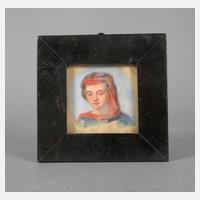 19. Jh., unsigniert, Gouache auf Seide, Schulterstück einer jungen Frau mit gesenktem Blick und gelöstem Schleier, hinter Glas in geschwärzter Leiste gefasst, Erhaltungsmängel, Maße 17 x 17 cm.