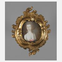 Ende 18. Jh., unsigniert, Gouache auf Elfenbein, Bruststück einer jungen Frau vor monochromem Fond, in rocailleverziertem feinen Messingrahmen hinter Glas gefasst, Altersspuren, H 8 cm.