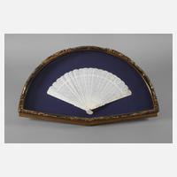 um 1900, ungemarkt, Elfenbein äußerst qualitätsvoll beschnitzt, die Lamellen teils durchbrochen gearbeitet, von figürlichen Darstellungen und Landschaftsmotiven verziert, textil verbunden, in schmaler gestuckter Leiste hinter Glas als Diorama gefasst, Maße 33 x 55 cm.