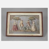 Augsburg, Mitte 18. Jh., rückseitig handschriftlich annotiert, montierte Szene aus Ausschneidebogen von Kupferstecher und Verleger Martin Engelbrecht, kolorierte Darstellung eines Musikzugs in Landschaft, mit Spiegel hinterlegt und von Glas als Schaukasten gefasst, Altersspuren, Maße 26 x 37 cm.
