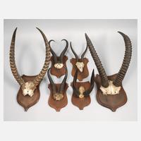 Anfang 20. Jh., sechs Stück, auf Nussbaumbretter montierte, verschieden große Gehörne von Springbock, Antilope, u.a., Altersspuren, H max. 70 cm.