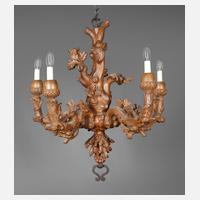 18. Jh., Holz geschnitzt, teils gestuckt, farbig gefasst bzw. goldbronziert, an drei zarten Gliederketten abgehängter figürlicher Leuchter mit plastisch gearbeiteter weiblicher Gestalt, Umschrift Temprani?, eingestecktes Damwildgehörn, ohne Elektrik, Alters- und Gebrauchsspuren, H ca. 50 cm, L ca. 60 cm.
