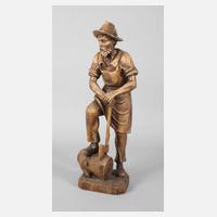 um 1910, Laubholz beschnitzt und bräunlich gefasst, vollplastische Darstellung eines kräftigen Waldarbeiters mit Axt, auf flacher facettierter Plinthe, min. Altersspuren, H 70 cm.