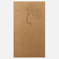 Brustbildnis einer Frau mit hochgestecktem Haar und roten Lippen, Farblithographie, Anfang 20. Jh., links unten in der Darstellung signiert "Gustav Klimt", leicht fleckig und gebräunt, hinter Glas gerahmt, Sichtmaße ca. 48,5 x 29,5 cm. Künstlerinfo: bedeut. österr. Maler, Zeichner und Graphiker und einer der bekanntesten Vertreter des Wiener Jugendstils und der Wiener Secession (1862 Baumgarten bei Wien bis 1918 Wien), Lehre zum Goldgraveur beim Vater Ernst Klimt d. Ä., mit Stipendium 1876–83 Kunststudium an der Wiener Kunstgewerbeschule bei Ferdinand Laufberger, Victor Berger, Ludwig Minnigerode, Karl Hrachowina und Michael Rieser, in den 1880er Jahren Ateliergemeinschaft "Künstler-Compagnie" mit Ernst Klimt und Franz Matsch, 1888–89 Studienreisen nach Krakau, Triest, Venedig und München, 1890 Ehrung mit dem Kaiserpreis, 1891–97 Mitglied der Genossenschaft bildender Künstler Wiens (Künstlerhaus), 1897 Mitgründer der Wiener Secession und 1897–99 deren erster Präsident, 1898–1903 Mitarbeit an der Secessions-Zeitschrift "Ver Sacrum", 1902 Schaffung des Beethovenfrieses, 1905 Austritt aus der Secession, 1905 vertreten auf der Ausstellung des Deutschen Künstlerbundes in Berlin, 1905 Villa-Romana-Preis, 1906 Reise nach Belgien und England und zum Ehrenmitglied der Königlich-Bayerischen Akademie der Bildenden Künste München ernannt, 1908 Florenzaufenthalt, 1909 Reise nach Paris, Madrid und Toledo, 1914 nach Brüssel, ab 1912 Präsident des Bundes Österreichischer Künstler, 1917 Ehrenmitglied der Akademie der Bildenden Künste Wien, beschickte Ausstellungen in Prag, Dresden, München, die Biennale in Venedig, Rom, Budapest, Mannheim und Berlin, tätig in Wien, 1900–16 regelmäßige Sommeraufenthalte am Attersee, Quelle: Thieme-Becker und Internet.
