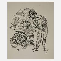 vor einem stehenden Mann im Dreck Liegender, Illustration zu "Lob des hohen Verstandes" von Victor Dirsztay, siehe Werksverzeichnis Wingler/Welz 108, Lithographie, 1917, im Stein monogrammiert "OK", minimal braunfleckig, unter Passepartout montiert, Darstellungsmaße ca. 19 x 16 cm, Blattmaße ca. 33,7 x 25,3 cm. Künstlerinfo: österreichischer Maler, Graphiker, Modelleur und Schriftsteller (1886 Pöchlarn bis 1980 Montreux), studierte an der Kunstgewerbeschule des Österreichischen Museums für Kunst und Industrie bei Gustav Klimt, W. Löffler und Adolf Loos, um 1910 Übersiedlung nach Berlin und Mitarbeit an der Zeitschrift "Der Sturm" von Herwarth Walden, 1911 Rückkehr nach Wien, tätig als Assistent an der Kunstgewerbeschule und Zusammenarbeit mit den Wiener Werkstätten, 1914 Mitglied der Freien Sezession Berlin und Kriegsfreiwilliger, nach Verwundung 1917 Übersiedlung nach Dresden, hier 1919-26 Mitglied des akademischen Rats und Professor an der Kunstakademie, bereits ab 1924 von seinen Professorenpflichten beurlaubt, unternimmt Kokoschka eine 7 Jahre andauernde Reise durch Europa, Nordafrika und die Länder am östlichen Mittelmeer, 1931 Rückkehr nach Wien und wechselnde Aufenthalte in Paris und Wien, 1933-45 als “entartet” diffamiert, 1934 Flucht nach Prag, hier Prof. an der Kunstakademie und 1937 Gründung des “Oskar-Kokoschka-Bundes”, 1938 Emigration nach England, 1946 britische Staatsbürgerschaft, 1953 Gründung der “Schule des Sehens” in Salzburg und Übersiedlung nach Villeneuve, in der Folge zahlreiche Reisen, Ausstellungen (z.B. documenta in Kassel) und internationale Ehrungen, 1975 wieder österreichischer Staatsbürger, Mitglied des Deutschen und des Österreichischen Künstlerbundes, Quelle: Thieme-Becker, Vollmer, Dressler und Wikipedia.