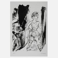 an Otto Dix angelehnte Szenerie mit der Darstellung eines eine Zigarette rauchenden Mannes, einer Frau mit entblößtem Hinterteil hinterher sehend, Lithographie, unter der Darstellung rechts in Blei signiert und datiert "F. Lohse (20)17" und links nummeriert "6/15", eingelegt in Mappe und hierauf in Blei bezeichnet "Dix -Litho- F. Lohse (20)17", Blattmaße ca. 30 x 20 cm. Künstlerinfo: dt. Maler und Graphiker, tätig in Gera.