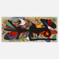 mehrere augenähnliche Gebilde und Pinselstriche in Schwarz vor bunt gespritztem Grund, Farblithographie auf leichtem Karton, um 1980, rechts unten im Stein signiert "Miró", mittig saubere Faltlinie, Blattmaße ca. 27,5 x 56,5 cm. Künstlerinfo: eigentlich Joan Miró i Ferrà, bedeutender spanischer Maler, Graphiker, Entwerfer und Plastiker (1893 Barcelona bis 1983 Palma de Mallorca), zunächst kaufmännische Ausbildung und Arbeit als Buchhalter, parallel Kunstunterricht, zeitweise in Mont-roig del Camp, studierte ab 1912 an der Akademie Barcelona, ab 1919 in Paris, hier Begegnung mit Picasso, 1920 an der Pariser Académie de la Grande Chaumière, 1926 zusammen mit Max Ernst Bühnenbild für „Romeo und Julia“, ab 1928 in Holland, erste Begegnung und lebenslange Freundschaft zu Alexander Calder, 1933 Zusammentreffen mit Wassily Kandinsky, ab 1939 in den USA, beschickte unter anderem mehrere Ausstellungen der documenta in Kassel, ab 1956 auf Mallorca tätig, erhielt zahlreiche Auszeichnungen, unter anderem die Ehrendoktorwürde der Harvard Universität, Quelle: Thieme-Becker, Vollmer, Wikipedia und Internet.
