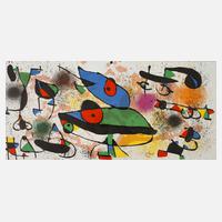 verschiedenfarbige Flächen und Farbspritzer, Farblithographie auf leichtem Karton, um 1980, unten im Stein signiert "Miró", mittig saubere Faltlinie, Blattmaße ca. 27,5 x 56,5 cm. Künstlerinfo: eigentlich Joan Miró i Ferrà, bedeutender spanischer Maler, Graphiker, Entwerfer und Plastiker (1893 Barcelona bis 1983 Palma de Mallorca), zunächst kaufmännische Ausbildung und Arbeit als Buchhalter, parallel Kunstunterricht, zeitweise in Mont-roig del Camp, studierte ab 1912 an der Akademie Barcelona, ab 1919 in Paris, hier Begegnung mit Picasso, 1920 an der Pariser Académie de la Grande Chaumière, 1926 zusammen mit Max Ernst Bühnenbild für „Romeo und Julia“, ab 1928 in Holland, erste Begegnung und lebenslange Freundschaft zu Alexander Calder, 1933 Zusammentreffen mit Wassily Kandinsky, ab 1939 in den USA, beschickte unter anderem mehrere Ausstellungen der documenta in Kassel, ab 1956 auf Mallorca tätig, erhielt zahlreiche Auszeichnungen, unter anderem die Ehrendoktorwürde der Harvard Universität, Quelle: Thieme-Becker, Vollmer, Wikipedia und Internet.