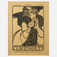 junge Frau mit Pelzschal, den Betrachter anblickend, Titelblatt der Zeitschrift Coccorico vom 30. Dezember 1899, Holzschnitt auf grobem, gelblichem Papier, rechts unten im Stock signiert "Mucha", hinter Glas gerahmt, Darstellungsmaße ohne Schrift ca. 23 x 18,5 cm, Blattmaße ca. 32,5 x 25,5 cm. Künstlerinfo: auch Alphonse Maria Mucha, tschech. Maler, Graphiker, Plakatkünstler, Illustrator und Kunstgewerbler (1860 Eibenschütz/Mähren bis 1939 Prag), bedeutender Vertreter des Jugendstils, zunächst von der Akademie Prag abgelehnt und künstlerisch Autodidakt, studierte 1879–81 an einer Schule für Bühnendekoration in Wien, gefördert vom Grafen Karl Khuen-Belasi, studierte mit dessen Unterstützung 1886–87 an der Akademie München bei Johann Caspar Herterich, anlässlich der Weltausstellung 1887 Übersiedlung nach Paris und kurzzeitig gemeinsames Atelier mit Paul Gaugin, lebt hier in einfachsten Verhältnissen und studierte 1890–94 an der Academie Julian bei J. P. Laurens, 1894 Durchbruch mit Plakatgestaltung für Sarah Bernhardt, die ihn schlagartig bekannt macht und zum begehrtesten Plakatkünstler der „Belle Époque“ avancieren ließ, in der Folgezeit gefragter Entwerfer für Gebrauchsgraphik, Glasfenster, Möbel, Schmuck, Teppiche, Theaterdekorationen und Kostümen, 1901 Ritter der Französischen Ehrenlegion, 1902 mit Auguste Rodin in Mähren, ab 1906 USA-Aufenthalt und Dozent an den Akademie in New York, Philadelphia und Chicago, ab 1910 bei Prag ansässig, 1939 von den dt. Truppen interniert und an den Folgen verstorben, Quelle: Thieme-Becker, Vollmer, Matrikel der Münchner Akademie und Internet.
