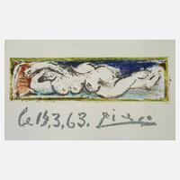ruhende nackte Frau, mit hinter dem Kopf verschränkten Armen und unter der Darstellung im Stein datiert und signiert "le 14.3.(19)63 Picasso", Farblithographie, Darstellungsmaße ohne Schrift ca. 4,5 x 16 cm, Blattmaße ca. 11 x 17,5 cm. Künstlerinfo: spanischer Maler, Graphiker und Bildhauer (1881 Malaga bis 1973 Mougins), studierte 1895 an der Kunsthochschule Barcelona, 1897 kurzzeitig an der Akademie San Fernando in Madrid, 1900 erster Parisaufenthalt, 1903 Übersiedlung nach Paris, tätig auch in Vallauris, Antibes, Aix-en-Provence und Mougins, Quelle: unter anderem Thieme-Becker, Vollmer und Wikipedia.