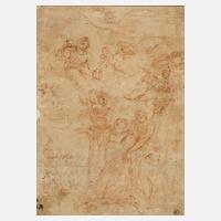 vielfigürliche Komposition mit Maria und dem Jesuskind, umgeben von Engeln, Rötel auf Papier und auf leichtem Karton kaschiert, wohl 17. Jh., rechts unten Sammlungsstempel, auf Unterlagekarton montiert und hierauf ungeprüfte Zuschreibung "Murillo", Erhaltungsmängel, Unterlagekarton mit Verlust an einer Ecke, Blattmaße ca. 19,5 x 15 cm.
