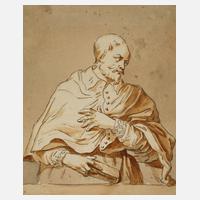 kniender Mönch in seiner Kutte, mit leicht nach oben gerichtetem Blick (wohl Darstellung des Heiligen Dominikus), Tuschefeder über Graphit, wohl 17. Jh., unten mittig Sammlungsstempel, rückseitig bezeichnet und ungeprüfte Zuschreibung "St. Dominigm Romanelli", rückseitig weiterhin Reste einer Zeichnung, auf Unterlagekarton montiert und hier bezeichnet "Romanelli", Papier ergänzt und hinterlegt, Blattmaße ca. 13,7 x 8,7 cm.