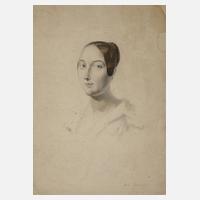 Bildnis einer jungen Frau, mit zum Betrachter gerichtetem Blick, Aquarell über Bleistift, rechts unten bezeichnet "Paul Delaroche", rückseitig teils unleserlich bezeichnet und datiert "Paul Delaroche ... 1840", braunfleckig, vier angegossene Stellen am Papier, unter Passepartout montiert, Blattmaße ca. 25,5 x 17,5 cm. Künstlerinfo: eigentlich Hipplolyte de la Roche, frz. Maler (1797 Paris bis 1856 ebenda), ab 1816 Ausbildung zum Landschaftsmaler bei Louis Étienne Watelet und anschl. bei Antoine-Jean Gros, 1822 erste Ausstellungsbeteiligung im Salon de Paris, ab 1932 Mitglied der Académie des Beaux-Arts, Lehrer an der École des Beaux-Arts, ab 1837 Fertigung des 27 Meter langen Monumentalgemäldes für den Prüfungssaal der École des Beaux-Arts, 1838 und 1843 Studienreisen nach Italien, 1849 Reise nach Deutschland, Quelle: Thieme-Becker und Wikipedia.
