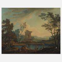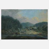 gebirgige, baumbewachsene Ideallandschaft mit Figurenstaffage, farbige Sande und Bindemittel auf Leinwand (genannt Sandmalerei oder Marmotinto), um 1825–30, auf Rückseite Etikett mit Beschriftung "Nr 196", einige Fehlstellen, hinter Glas in Vergolderleiste gerahmt, Sichtmaße ca. 57,5 x 74 cm. Künstlerinfo: dt. Maler und Erfinder der Sandmalerei (Marmotinto) (1762 Memmingen bis 1831 London), erlernte die Grundlagen des Zeichnens von einem Mönch aus dem Kloster Ottobeuren, ab 1781 in Amsterdam ansässig, ab 1783 in London und hier als Tischdekorateur von König Georg III. ernannt, um 1825 entwickelte er die Sandmalerei, welche er Marmortinto nannte, Quelle: Thieme-Becker und Wikipedia.