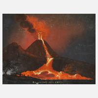 Lava speiender Vulkan mit Lavafluss in nächtlicher Landschaft, Gouache, um 1860, unter Glas gerahmt, Falzmaße ca. 8,5 x 11,5 cm.