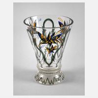monogrammiert und datiert (19)22, farbloses Glas, ausgekugelter Abriss, der Fuß hohl in den Schaft und die hohe Kuppa übergehend, schwarz konturierte Art-déco-Bemalung, gezackte Floralmotive in Gelb, Blau und Grün, am Mündungsrand minimal bestoßen, H 16,5 cm.