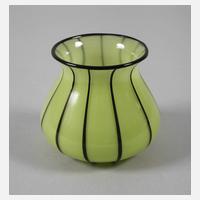 1920er Jahre, mit geometrischem Dekor nach Michael Powolny, farbloses Glas mit hellgrünem Unterfang, ausgekugelter Abriss, Streifendekor aus dunkelviolettem, schwarz scheinendem Glas, guter Zustand, H 10 cm.