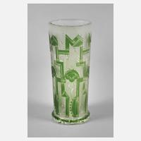 wohl Haida oder Steinschönau, um 1925, farbloses Glas grün überfangen, aufwendig geätzt, geschliffen und poliert, verziert mit gezackten Floralismen, an der Mündung eine stecknadelkopfgroße Vertiefung, sonst guter altersgemäßer Zustand, H 26 cm.