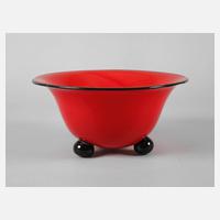 1920er Jahre, farbloses Glas, ausgekugelter Abriss, hellroter Unterfang, die kugeligen Füße und der aufgelegte Rand aus dunkelviolettem, schwarz scheinendem Glas, geringe Herstellungsfehler, Altersspuren, D 26,5 cm.