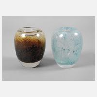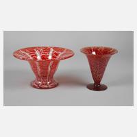 1920er Jahre, mit geometrischem Dekor nach Michael Powolny, farbloses Glas, ausgekugelter Abriss, in opalinem Weiß unterfangen, Streifendekor aus dunkelviolettem, schwarz scheinendem Glas, guter Zustand, H 8,5 und 12 cm.