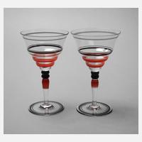 um 1930, unbekannter Entwurf, Hersteller Freiherr von Poschinger'sche Krystallglasfabrik Frauenau, farbloses Glas, die untere Kuppahälfte dreifach abgestuft, horizontale Bemalung mit schwarzen und roten Bändern, guter Zustand, H je 15,5 cm. Quelle: Udo Schröder, Trinkgläser vom Jugendstil zum Art déco, 1998, S. 163.