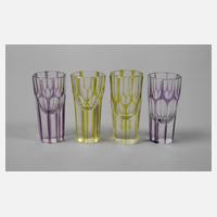 in der Art von Otto Prutschers Stängelgläsern um 1912, massives farbloses Glas, uranfarben und violett überfangen, geometrischer Schliff, von der Herstellung etwas blasig, eins am Stand mit Oberflächenchip, H je ca. 7 cm.