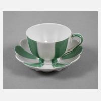 Entwurf Josef Hoffmann 1929, unterglasurblaue Stempelmarken ab 1924, gepinselte Dekornummer 5539 7., Untertasse mit zusätzlichem Sonderstempel vor 1938, mehrfach gerippte Form, Rippenbögen alternierend mit grüner Aufglasurstaffage, Untertasse am Rand mit einem Chip, sonst guter Zustand, H gesamt 5 cm.
