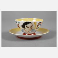 Dekorentwurf und Ausführung Mathilde Flögl um 1920, ungemarkt, jeweils gepinseltes Monogramm FM, glatte, fast konische Tassenform mit ausgestelltem Stand, umlaufender Dekor und Kantenstaffage in farbenfroher Aufglasurbemalung, schauseitig Darstellung eins Damenkopfes mit modischer zeittypischer Frisur, flankiert von einem stilisierten Landschafts-, Architektur- und Floralmotiv, dazugehörige Untertasse mit korrespondierendem Dekor, seltenes Stück in gutem Zustand, Lippe mit minimalem herstellungsbedingten Glasurfehler, H gesamt 5 cm. Quelle: https://sachsen.museum-digital.de, Grassi Museum, vgl. Tassen Inv.Nr. 1977.118a/b.